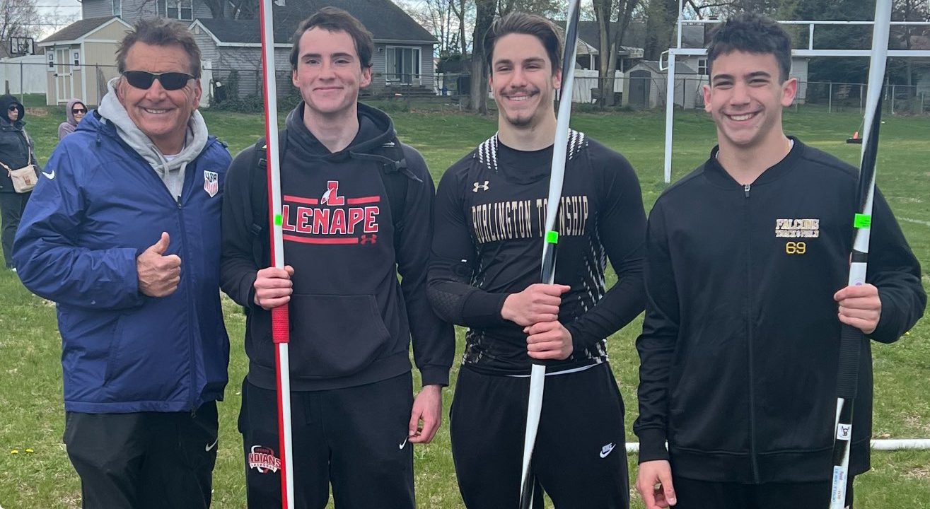 Congratulations to Miles Acchione (Lenape), Dylan Fitzpatrick (Burlington) and Anthony Barber (Burlington) for placing 1,2,4 in the javelin at the Don Danser Invitational Meet at RV High School. Miles exploded twice with a 180′ and 182′-6″ toss in the cold and windy conditions. Dylan and Anthony threw personal bests. Dylan hit a 172′-6″ bomb and Anthony had a 145′ toss. Great job today from the Mirabelli Throwing School. More to come!